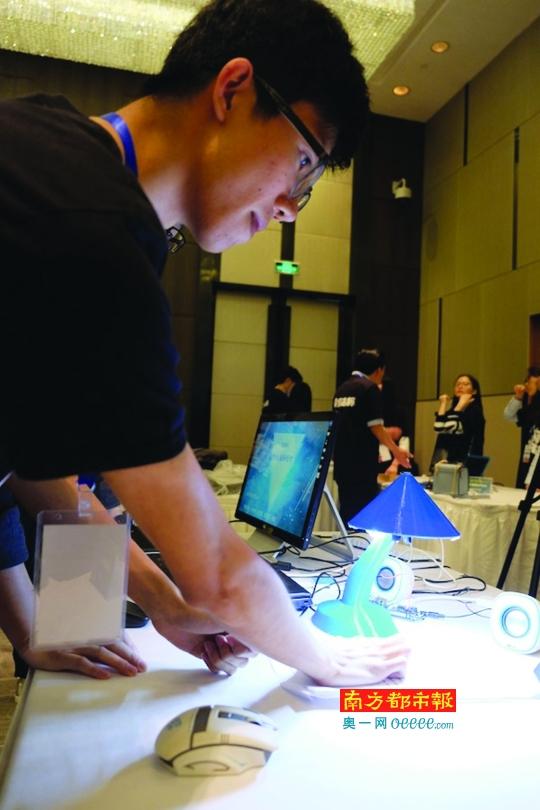 珠海大學(xué)生研發(fā)的可翻譯智能臺燈獲優(yōu)勝獎,一名學(xué)生正在演示。